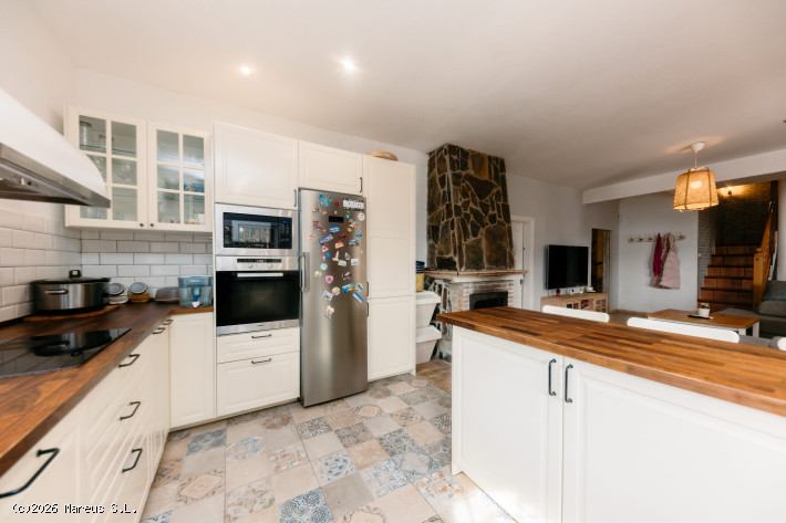 La planta baja incluye un salón comedor con cocina abierta y chimenea, una sala polivalente actualmente utilizada como despensa y un baño completo con ducha. Desde aquí se accede a un porche de aproximadamente 70 m² con barbacoa de obra, perfecto para reuniones y para disfrutar del aire libre.